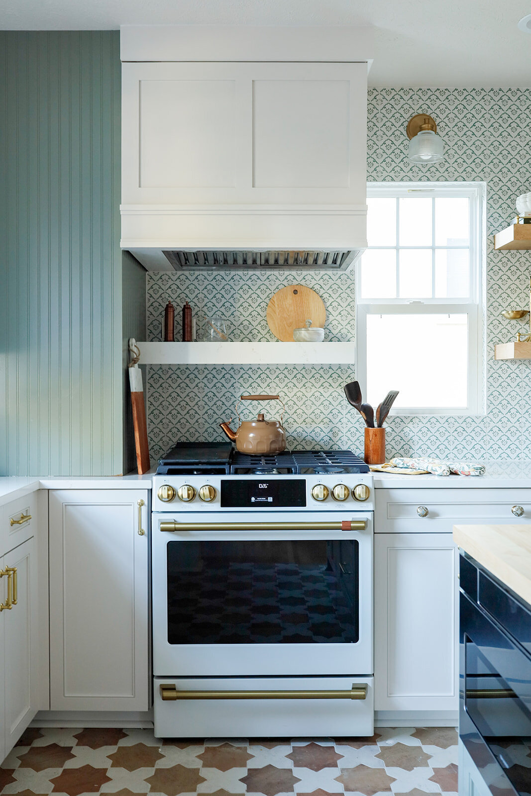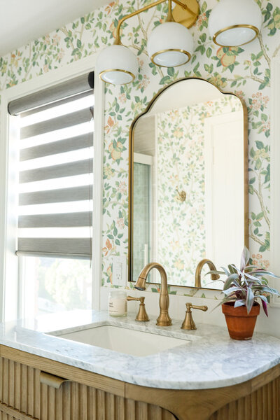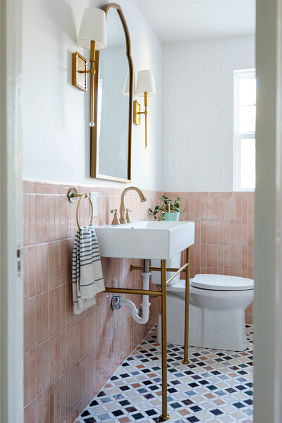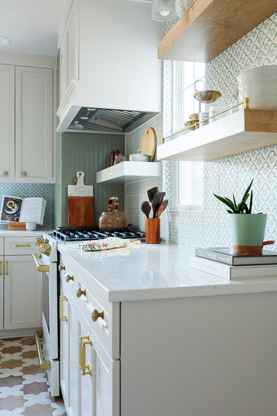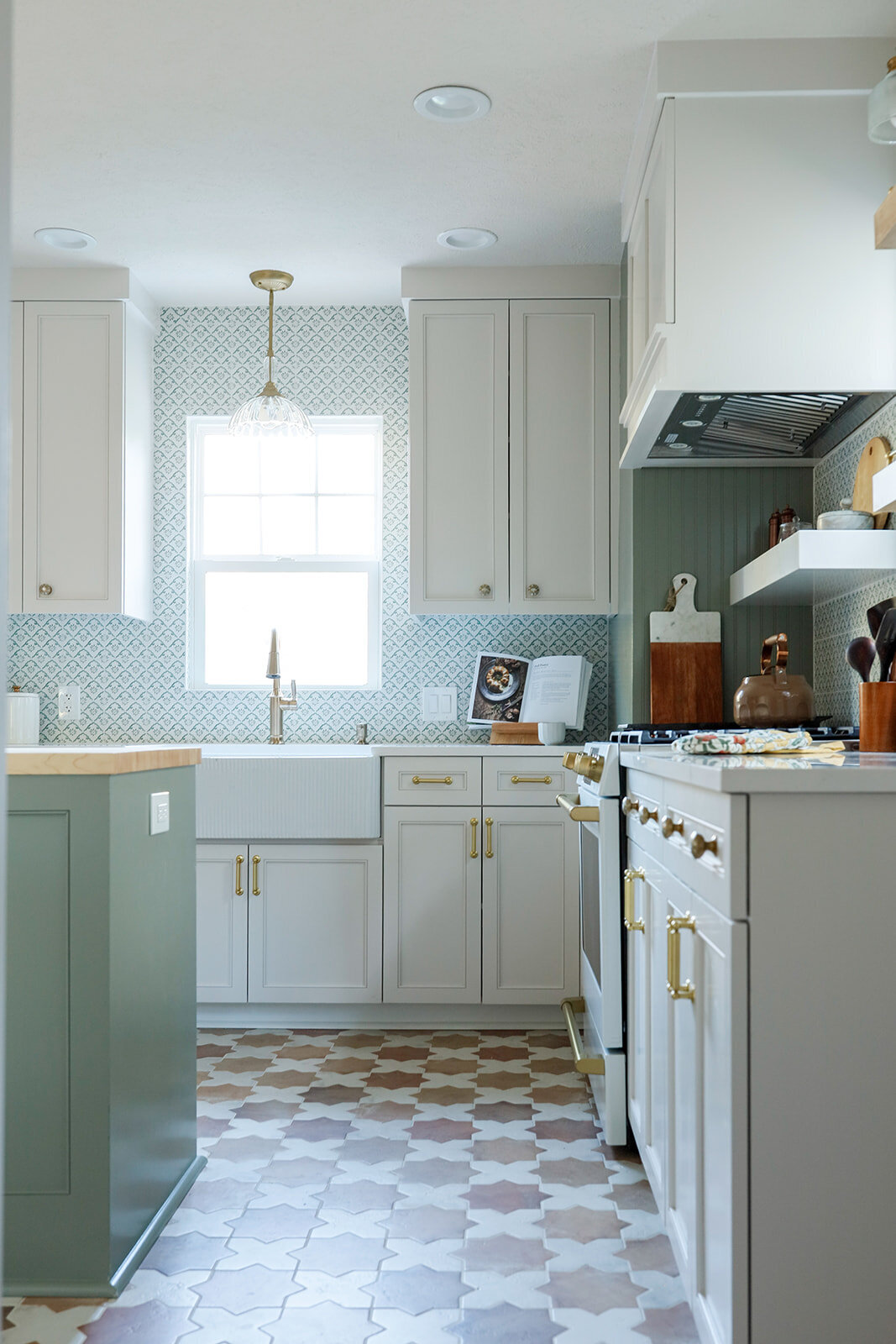 Layered greens, warm tones, and brass accents played into the home's mid-century charm, while modern materials like quartz counters and handmade-style tile kept the palette feeling fresh.
